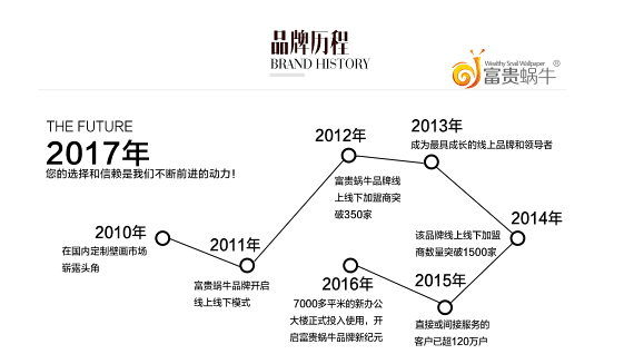 2017年 您的选择和信赖是我们不断前进的动力!2016年 森林贵族品牌积极开拓海外市场。2015年 7000多平米的新办公大楼正式投入使用。2014年 富贵蜗牛品牌成为最具成长的线上品牌和领导者。2013年 公司旗下的森林贵族品牌正式上线。2012年 国内先进的壁画全套生产设备正式投入使用。2011年 富贵蜗牛品牌开启线上线下模式。2010年 公司旗下的富贵蜗牛品牌开始在国内定制壁画市场崭露头角。